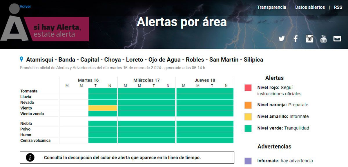 A su vez, el organismo emitió un alerta amarilla por vientos para gran parte del territorio santiagueño. En concreto, esta alerta se produciría en los departamentos Atamisqui, Banda, Capital, Choya, Loreto, Ojo de Agua, Robles, San Martín y Silípica.