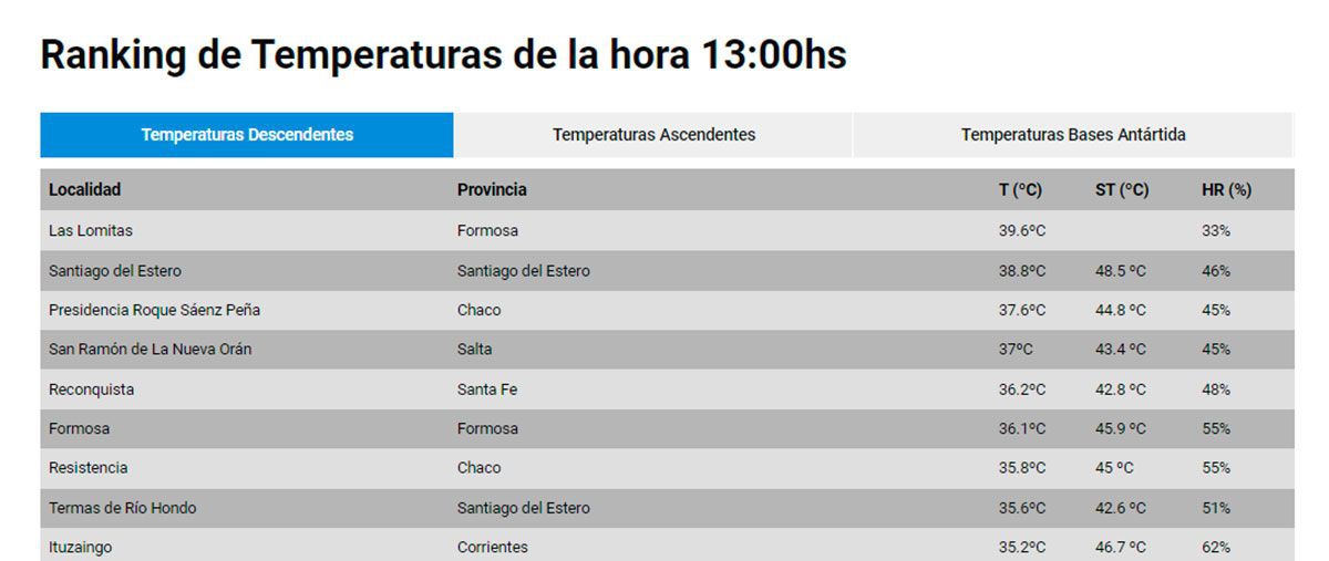 El ranking de temperaturas del SMN mostró en sus tabla de estadísticas que, la provincia, es la más calurosa, junto a Formosa y Chaco. ¡Un verdadero infierno!