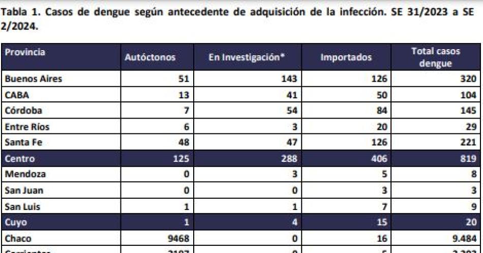 Según el reporte del organismo nacional, Santiago del Estero presentó en la semana epidemiológica (SE) 31 del 2023 y la segunda del 2024, 73 casos, en los que sólo uno sería importado. Precisa el informe del boletín que los casos en nuestra provincia se presentan en los departamentos Capital, Copo, Robles y San Martín.
