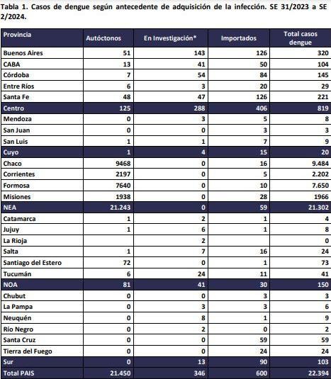 El Sistema Nacional de Vigilancia de la Salud reportó desde la última semana de julio de 2023 hasta el pasado 14 de enero, 22.394 casos de dengue, y 10 muertes en Corrientes y otras ocho en Misiones.
