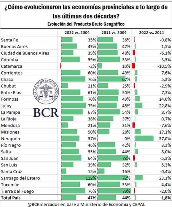 Un informe realizado por los especialistas Guido D'Angelo y Emilce Terré para la Bolsa de Comercio de Rosario, reflejaron que Neuquén, Santiago del Estero y Jujuy, se encuentran entre las provincias con mejor desempeño a pesar de las sucesivas recesiones entre 2011 y 2022.