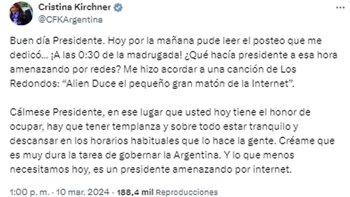 Luego de hacer hincapié en el horario en el que escribió Milei por X, la expresidenta cerró: “Créame que es muy dura la tarea de gobernar la Argentina. Y lo que menos necesitamos hoy, es un presidente amenazando por internet”.