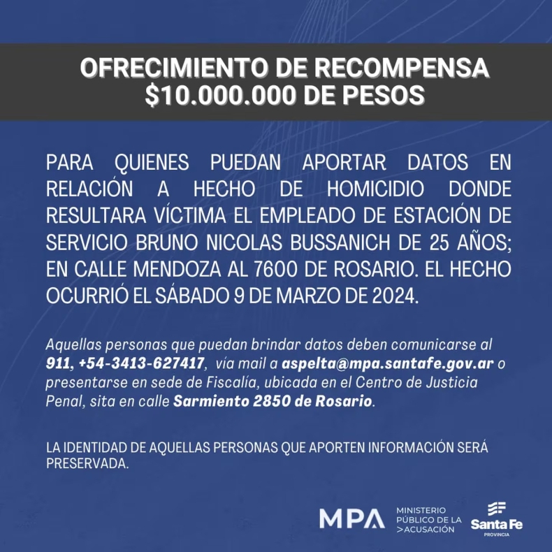 El Ministerio Público de Acusación (MPA) de Rosario está ofreciendo una recompensa de $10 millones a quienes proporcionen información relevante sobre el presunto sicario responsable del asesinato del playero Bruno Nicolás Bussanich ocurrido el pasado sábado por la noche.
