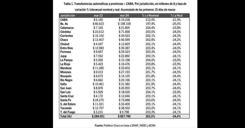De acuerdo con un informe que realizó Politicón Chaco (ver cuadros) en base a datos de la Dirección Nacional de Asuntos Provinciales (DNAP), el Indec y el BCRA, en los primeros 15 días de marzo hubo una caída promedio del 24,4% en las transferencias automáticas a las provincias más Caba.