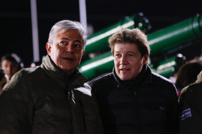 Gobernadores. El de Neuquén, Rolando Figueroa, y el del Tierra del Fuego, Gustavo Melella, anoche en la vigilia.