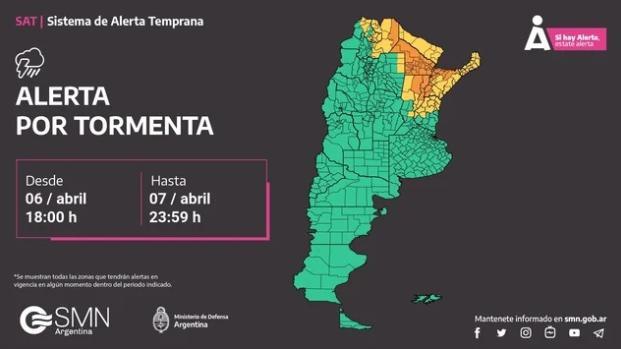 El aviso es un alerta amarillo por tormentas Corrientes, Misiones, Chaco, Formosa, Santa Fe, Santiago del Estero, Salta y Jujuy.