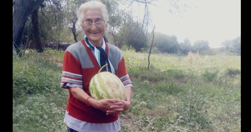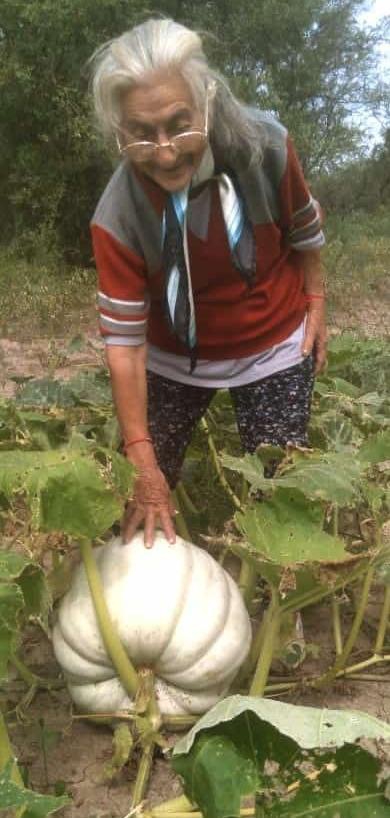 Apoyada con su bastón de huíñaj, doña Amalia Ponce de Araujo, de 92 años, atiende el teléfono y no hace falta ninguna pregunta, sólo empieza a hablar y a contar toda su vida y su nieta Tamara Coronel revela rápidamente su abuela siempre quiso "salir en el diario" y la cosecha de zapallos gigantes con sequía y todo le dio esa oportunidad.