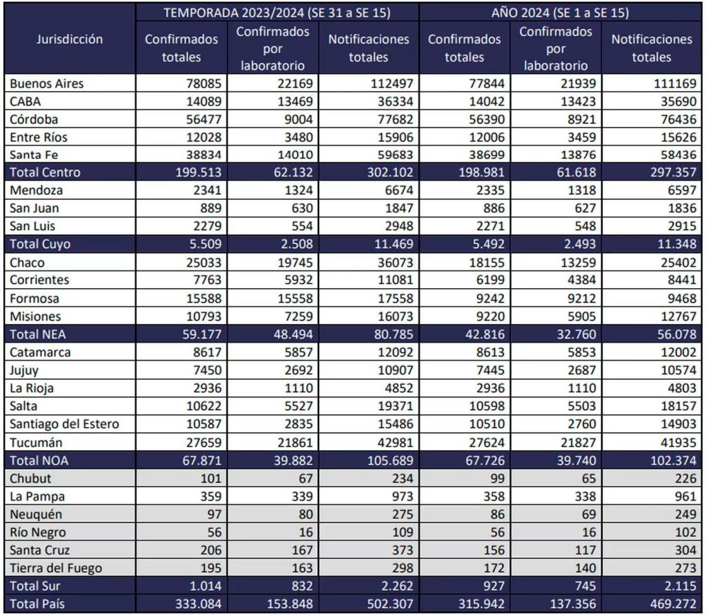 “Los casos acumulados hasta la semana 15 representan 3,17 veces más que lo registrado en el mismo período de la temporada anterior y 9,1 veces más que lo registrado en el mismo período de 2019/2020″, señaló el relevamiento.
