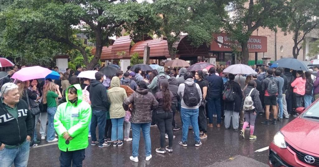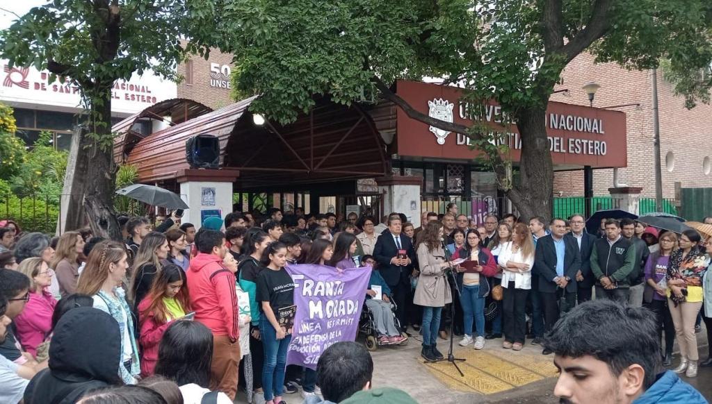 Pese a la llovizna, la medida estratégica se lleva a cabo desde las 16 horas en la Universidad Nacional de Santiago del Estero con la lectura de documentos ante la presencia de autoridades del establecimiento.