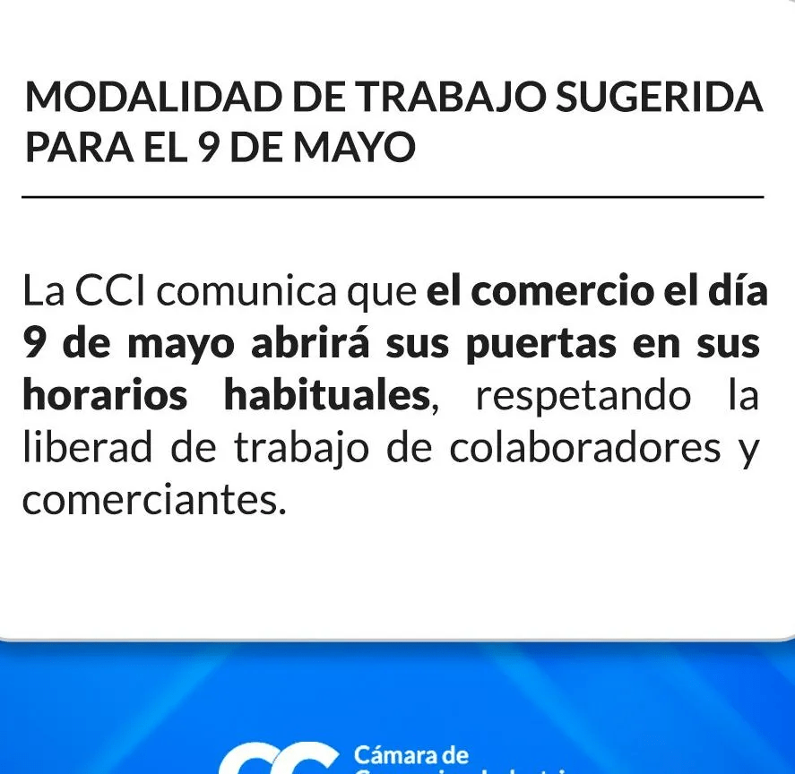 "La Cámara de Comercio e Industria comunica que el comercio el día 9 de mayo abrirá sus puertas en sus horarios habituales, respetando la libertad de trabajo de colaboradores y comerciantes", indicaron a través de un comunicado.