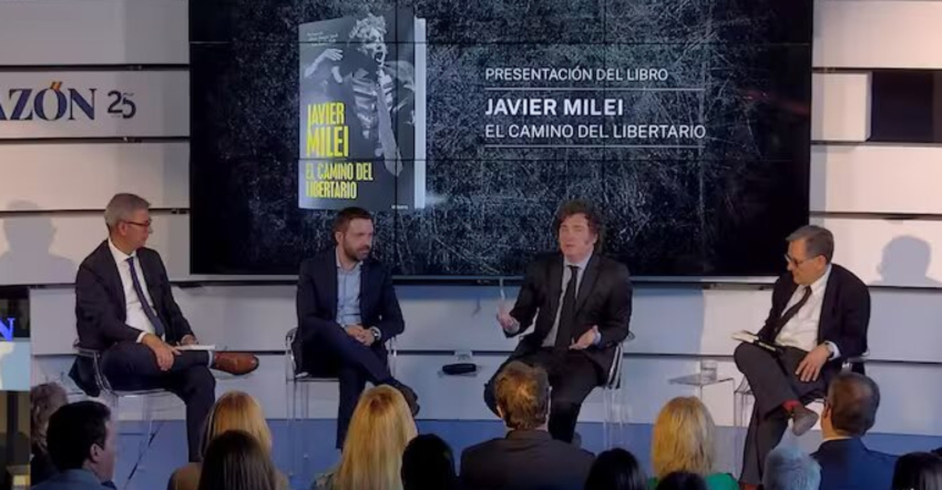 Javier Milei comenzó su visita a Madrid con la presentación pública de su penúltimo libro, "El camino del libertario", en la sede del diario La Razón, propiedad del grupo Planeta, que también es el editor de la obra.
