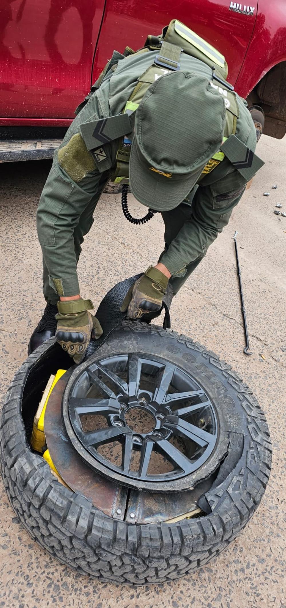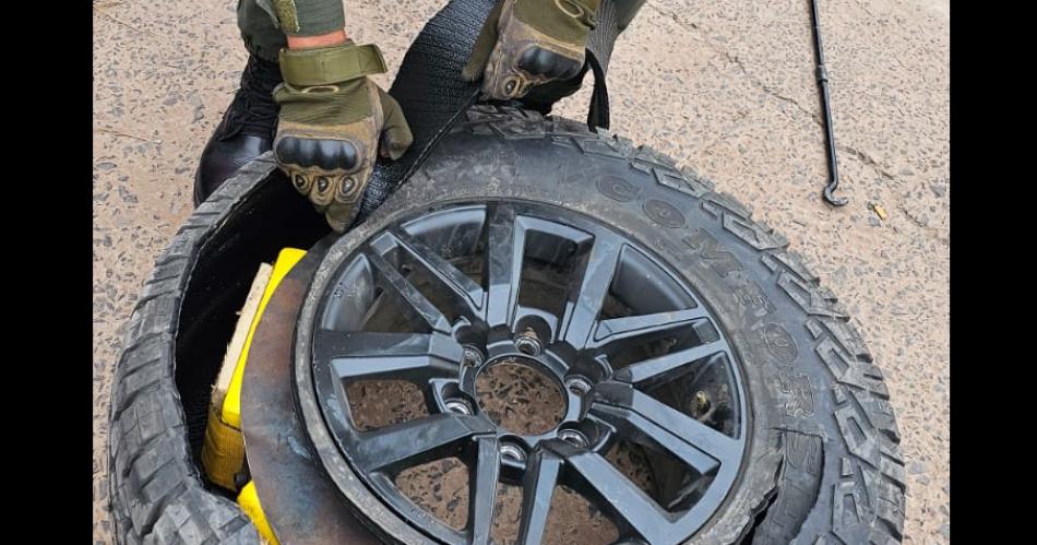 Ante el presunto nerviosismo de los dos hombres, los gendarmes solicitaron la colaboración del can antinarcóticos "Dilan", quien reaccionó de inmediato a la presencia de sustancia en los neumáticos, visiblemente con poca presión de aire.