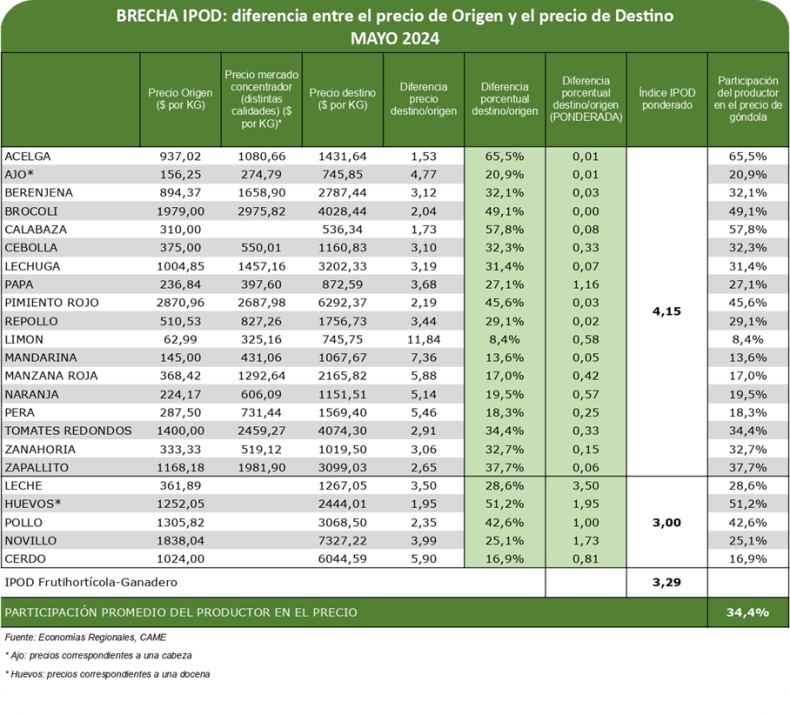 Según el Índice dePrecios en Origen y Destino(IPOD) elaborado por el sector de Economías Regionales de laConfederación Argentina de la Mediana Empresa(CAME), en mayo los precios de los agroalimentos se multiplicaron por 3,3 veces del campo (origen) a la góndola (destino). Es decir, el consumidor pagó $ 3,3 por cada $ 1 que recibió el productor.