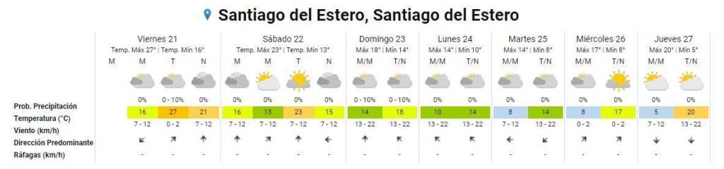 En Santiago del Estero, el pronóstico extendido del Servicio Meteorológico Nacional (SMN) indica que las temperaturas comenzarán a descender significativamente a partir del lunes 24 de junio.