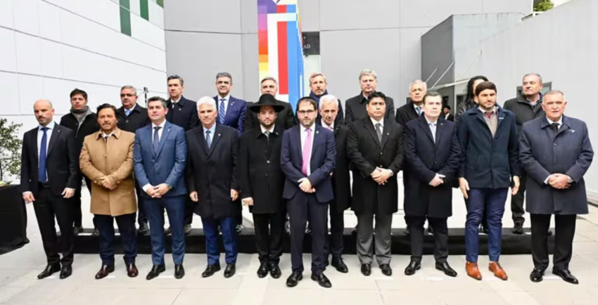 Por la AMIA lideró el acto Amos Linetzky, presidente de la entidad, en tanto que participaron los gobernadores Axel Kicillof (Buenos Aires), Jorge Macri (CABA), Maximiliano Pullaro (Santa Fe), Rogelio Frigerio (Entre Ríos), Osvaldo Jaldo (Tucumán) y Alfredo Cornejo (Mendoza).