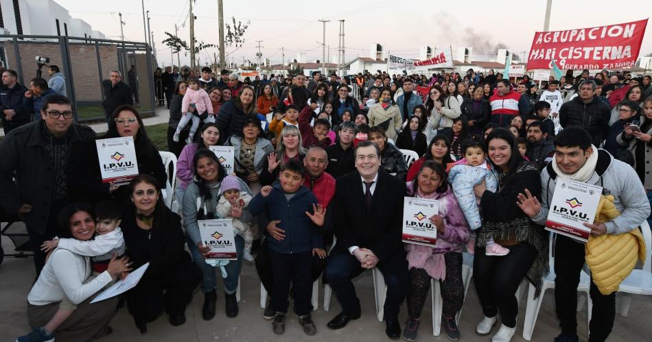 Tras la entrega de carpetas a un grupo de adjudicatarios, el gobernador se dirigió a las familias beneficiarias, trabajadores de la Uocra y a la gran cantidad de vecinos, a quienes expresó su alegría por poder continuar con el plan de obras, pese a la situación económica nacional, y adelantó que este viernes serán entregados otros 92 dúplex en el barrio Mariano Moreno.