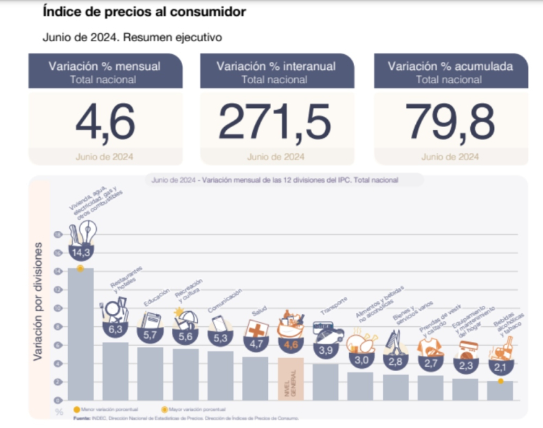 Tiempo de lectura: 1 minuto, 5 segundos12/07/2024 - 16:14 hs-La inflación llegó al 4,6% en junio y al 271,5% el último año, según informó hoy el Instituto Nacional de Estadísticas y Censos (Indec).