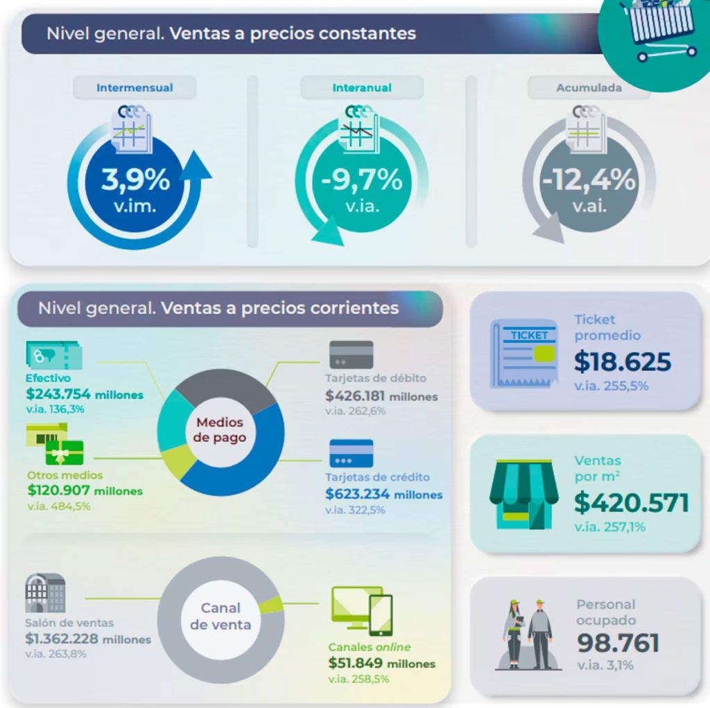 Además, el informe precisó que las ventas a precios corrientes realizadas con medios de pago como billeteras virtuales ascendieron a 120.906.992 miles de pesos, lo que representa el 8,6% del total y muestra un aumento del 484,5%.