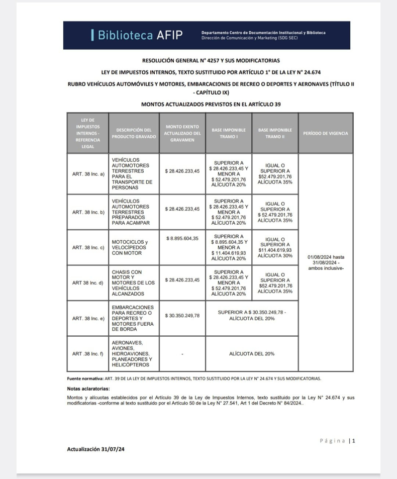 La Administración Federal de Ingresos Públicos (AFIP) actualizó este miércoles la base del impuesto al "lujo" para autos 0km. Lo pagan vehículos automotores de más de $ 40.500.000.