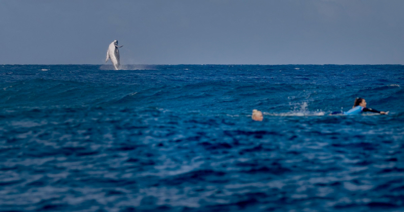 La competencia de surf de este año se está realizando en Tahití, a casi 16.000 kilómetros de París, donde las ballenas se congregan en las proximidades del archipiélago durante las temporadas de apareamiento, nacimiento y migración.