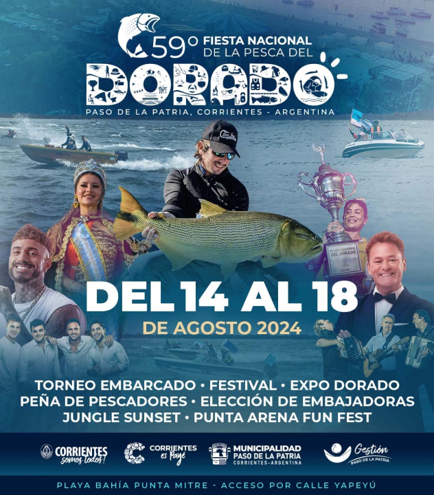 Tiempo de lectura: 2 minutos, 3 segundos13 de Agosto, 2024-Paso de la Patria situada a orillas del río Paraná, se alista para recibir a miles de visitantes y entusiastas de la pesca deportiva con la 59° Edición de la Fiesta Nacional de la Pesca del Dorado. El evento se llevará a cabo del 14 al 18 de agosto de 2024, destacando la competencia de pesca deportiva como el plato fuerte del festival.