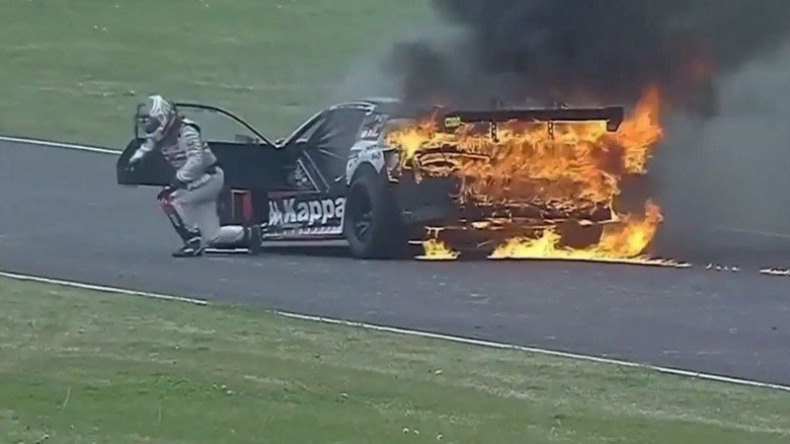 Los bomberos apagaron el fuego y la carrera fue neutralizada para retirar el flamante Camaro estrenado en esta fecha por el expiloto de Minardi y Prost.