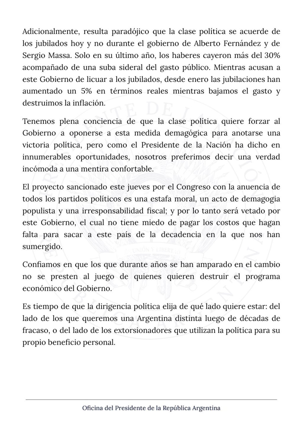 El Gobierno apuntó también contra quienes votaron positivamente el proyecto. "Resulta paradójico que la clase política se acuerde de los jubilados hoy y no durante el gobierno de Alberto Fernández y de Sergio Massa. Sólo en su último año, los haberes cayeron más del 30% acompañado de una suba sideral del gasto público. Mientras acusan a este Gobierno de licuar a los jubilados, desde enero las jubilaciones han aumentado un 5% en términos reales mientras bajamos el gasto y destruimos la inflación", precisó.
