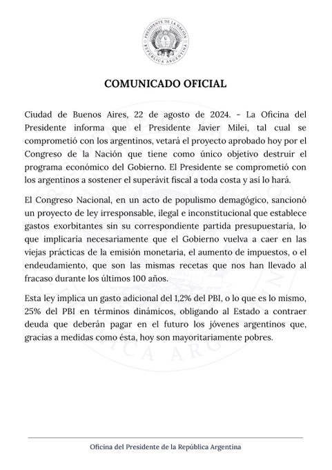 Desde la cuenta Oficina del Presidente "informa que el Presidente Javier Milei, tal como se comprometió con los argentinos, vetará el proyecto aprobado hoy por el Congreso de la Nación", se remarcó en el inicio del texto.