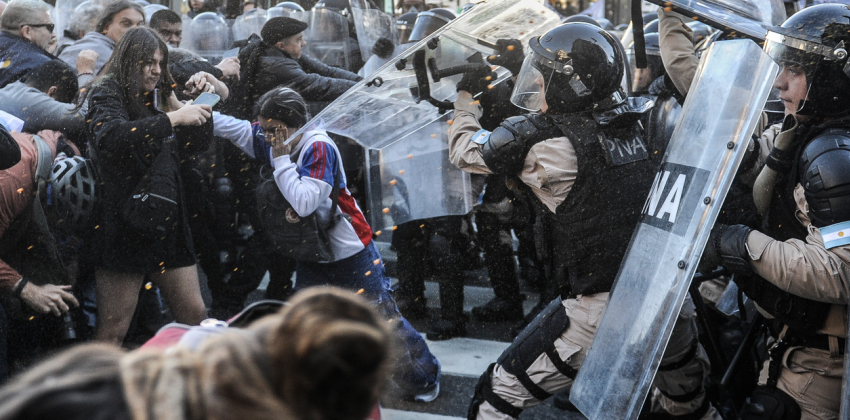 Los primeros incidentes se dieron cerca de las 16 entre manifestantes y las fuerzas de seguridad. Hubo empujones y corridas cuando las organizaciones bajaban a la calle para iniciar la marcha. Del lado de los uniformados se pudo advertir la presencia de efectivos de Gendarmería, Prefectura y Policía Federal, que se habían desplegado más temprano en cordones para impedir que los manifestantes bajen de la vereda y corten la calle.