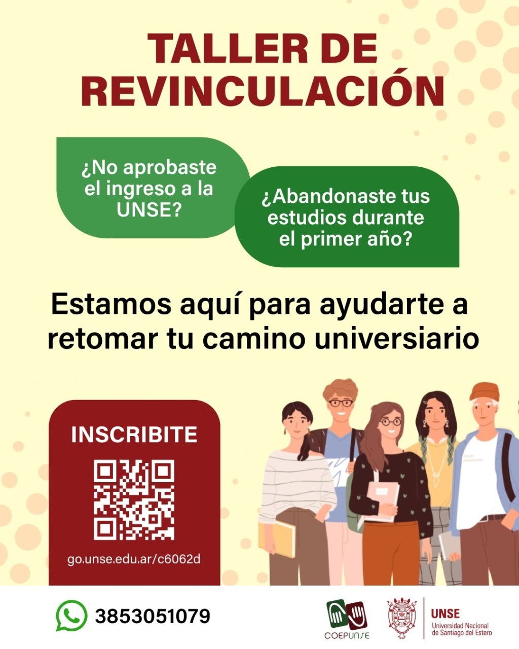 Tiempo de lectura: 37 segundosEl Centro de Orientación Educativa y Psicopedagógica (COEP) de la UNSE, en el marco del Programa Sigamos Estudiando, invita a todas las personas que no hayan aprobado el ingreso o hayan abandonado sus estudios durante el primer año en 2022, 2023 o 2024 a participar del Taller de Revinculación.