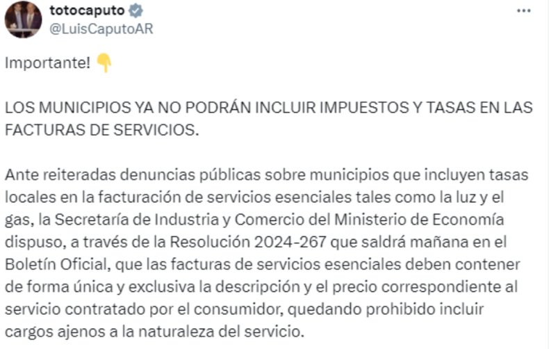 El ministro de Economía, Luis "Toto" Caputo, anunció a través de sus redes sociales que los intendentes no podrán incluir tasas municipales en las boletas de servicios públicos.