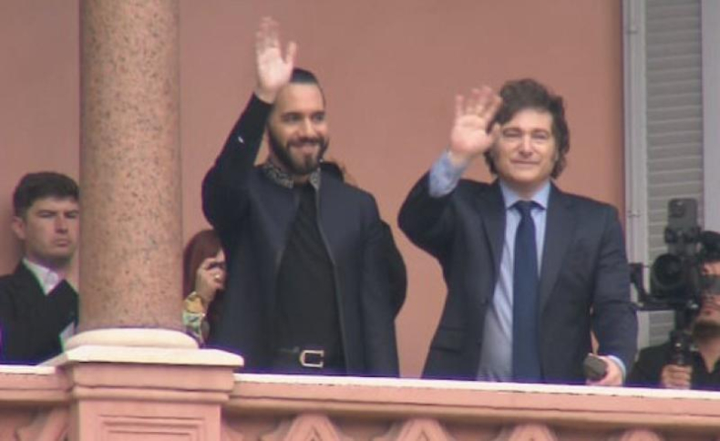 El presidente Javier Milei mantuvo este lunes por la tarde una reunión bilateral con su par de El Salvador, Nayib Bukele, en Casa Rosada. El mandatario esperó al invitado en el salón de los bustos y luego se dirigieron al despacho presidencial. Una vez terminado el encuentro, el jefe de Estado invitó a Bukele a saludar desde el balcón presidencial.