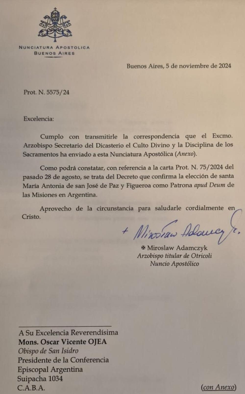 El Dicasterio del Culto Divino y Disciplina de los Sacramentos de la Santa Sede ha ratificado la elección de María Antonia de Paz y Figueroa, conocida como Santa Mama Antula, como la nueva patrona de las misiones en Argentina. Esta confirmación fue realizada a través de una carta que lleva la firma de Miroslaw Adamszyk, Arzobispo titular de Otricoli y Nuncio Apostólico.