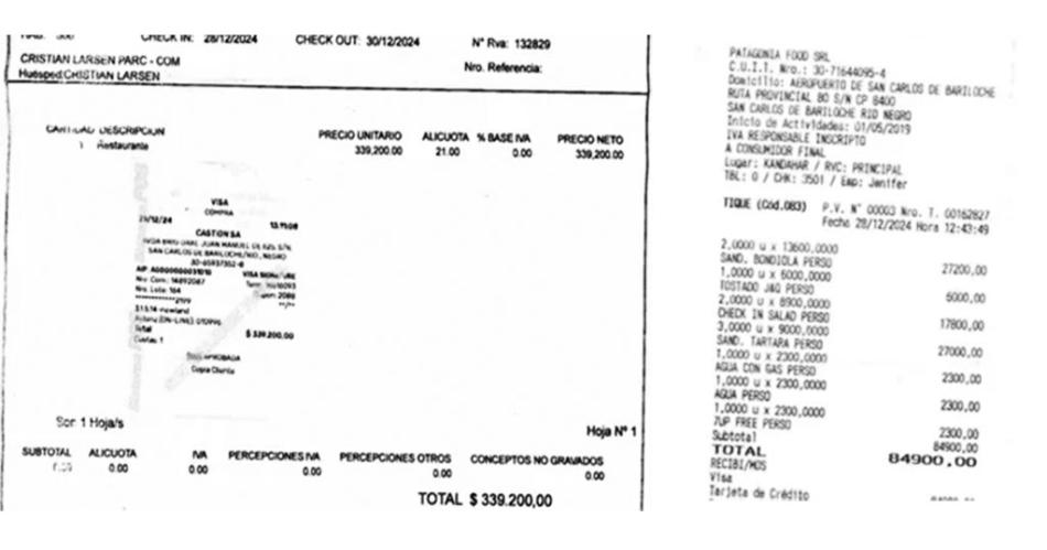 Dentro de las facturas que Larsen presentó para justificar las erogaciones en concepto de viáticos durante las 24 horas que duró su estadía en Río Negro, se constató el consumo por un "almuerzo de trabajo" en el Cacique Inacayal Lake Spa Hotel por 339.200 pesos al día siguiente de su arribo.