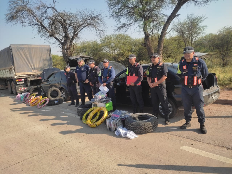 Agentes viales con funciones en el puesto de control de Río Muerto incautaron ayer a la siesta 32 neumáticos de contrabando. Eran transportados en dos automóviles. En el operativo demoraron dos vehículos, uno marca Volkswagen Voyage y otro Ford Focus, guiados por un hombre de 30 y un joven de 23 años.