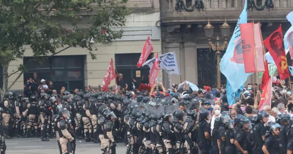 "¿Tampoco se puede reclamar en la vereda? ¿Dónde estamos?", se escuchó decir a un manifestante mientras era corrido por efectivos de las fuerzas de Seguridad, que responden al protocolo establecido por Patricia Bullrich.
