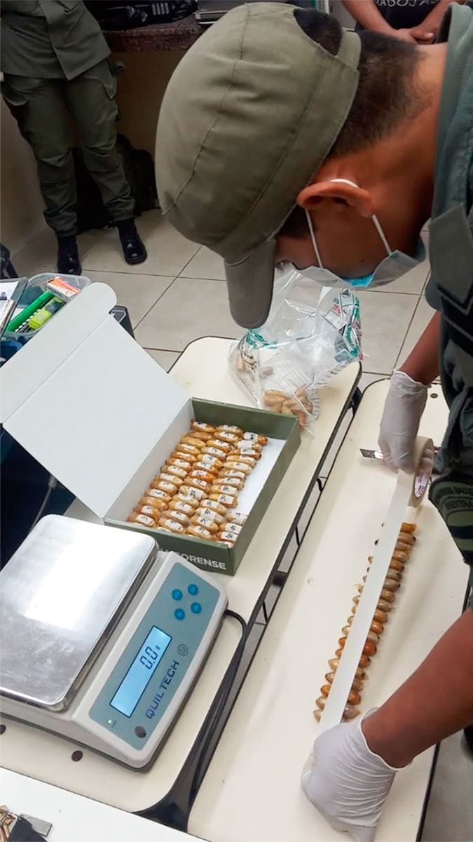 Una vez en el hospital, los detenidos expulsaron las cápsulas, las cuales fueron sometidas a pruebas de campo mediante el uso de Narcotest, que confirmaron que contenían cocaína. El peso total de la droga incautada alcanzó los 1 kilo 939 gramos.