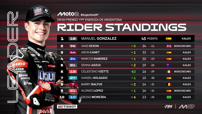 Con este resultado, González sigue al frente del Mundial, aunque Dixon se mete de lleno en la pelea. La próxima cita de Moto2 será en el Circuito de las Américas, donde los pilotos buscarán seguir sumando en la lucha por el campeonato.