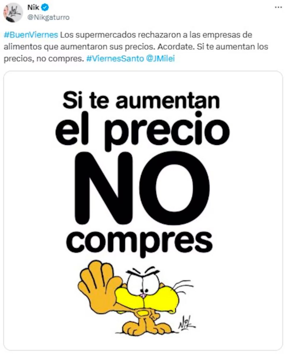 El mandatario también replicó en la red social X un mensaje del humorista gráfico en el que celebraba la decisión de los supermercados de rechazar incrementos de hasta un 12% en productos esenciales como harinas y aceites.