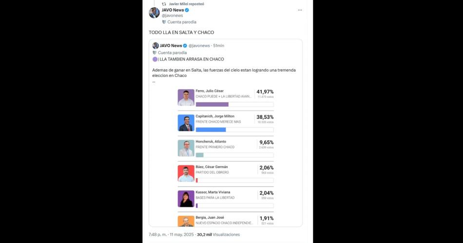 El presidente Javier Milei celebró las victorias de La Libertad Avanza (LLA) en la capital salteña y en la alianza chaqueña con la Unión Cívica Radical.