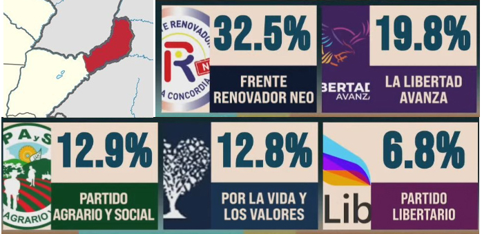 Hasta el momento, la tendencia indica que el Frente renovador se impone con el 32.5%; se ubica el partido del presidente Javier Milei, La Libertad Avanza con 19.8%; tercero está el Partido Agrario Social y Social con 12.9%, muy cerca se ubica el Movimiento por la Vida y los Valores con 12.8%, minetas que el Partido Libertario suma 6.8%