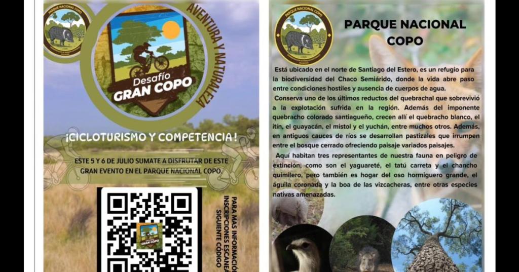 MONTE QUEMADO, Copo. El Parque Nacional Copo, ubicado en el norte de Santiago del Estero, será escenario de una experiencia inédita en la región: el Desafío Gran Copo, un evento que combinará la competencia ciclista, el cicloturismo y el amor por la naturaleza a través de un recorrido agreste por el majestuoso bosque chaqueño.