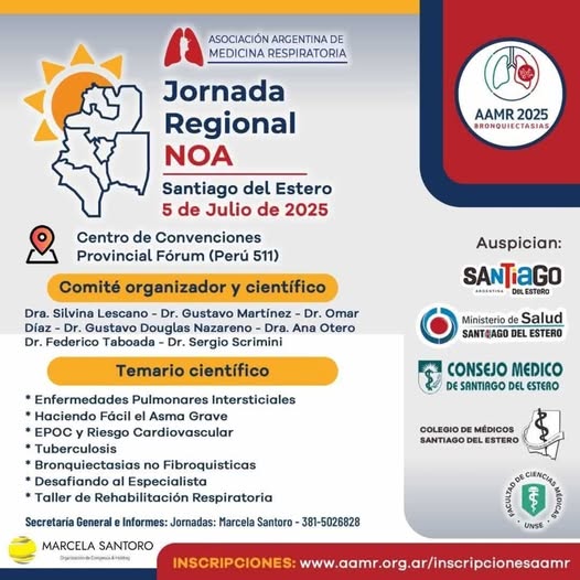 Tiempo de lectura: 38 segundosLa Facultad de Ciencias Médicas de la Universidad Nacional de Santiago del Estero, junto con el Gobierno provincial, el Ministerio de Salud, el Consejo Médico y el Colegio Médico de la provincia, auspician la Jornada Regional NOA de Medicina Respiratoria, que se llevará a cabo el 5 de julio en el Centro de Convenciones Forum.
