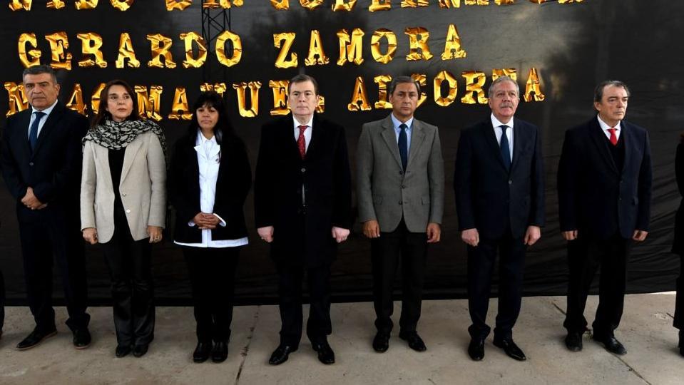 Zamora estuvo acompañado por el vicegobernador Carlos Silva Neder; el jefe de Gabinete, Elías Suárez, y los ministros de Educación, Mariela Nassif; de Desarrollo Social, Ángel Niccolai; de Obras Públicas, Aldo Hid, y de Producción, Miguel Mandrille. También el secretario de Obras Públicas, Jorge Zuaín, y la presidente del Consejo General de Educación, María Elena Herrera, junto con el comisionado local, Hugo Castillo.