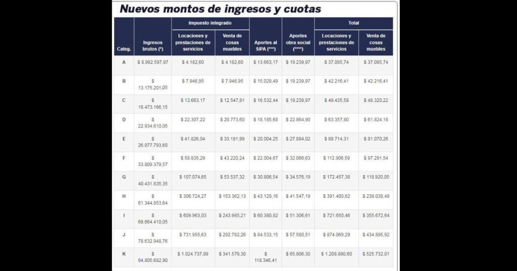 Estas modificaciones incluyen nuevos topes de ingresos brutos, montos mensuales de impuesto integrado y actualizaciones en las contribuciones previsionales y de salud, según lo dispuesto por la normativa vigente.
