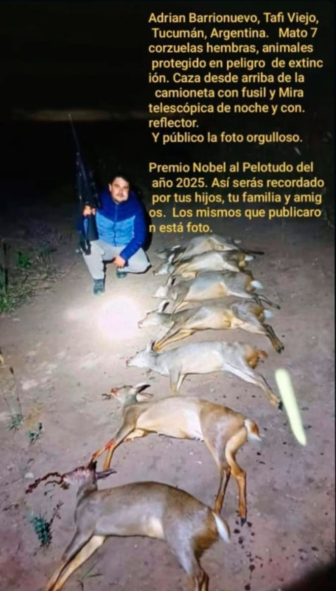Un grave caso de caza furtiva en Tucumán generó indignación tras viralizarse imágenes donde un hombre posa orgulloso junto a los cuerpos de siete corzuelas hembras, especie protegida y en peligro de extinción. El responsable, identificado como Adrián Barrionuevo, vecino de Tafí Viejo, fue detenido tras un operativo policial.