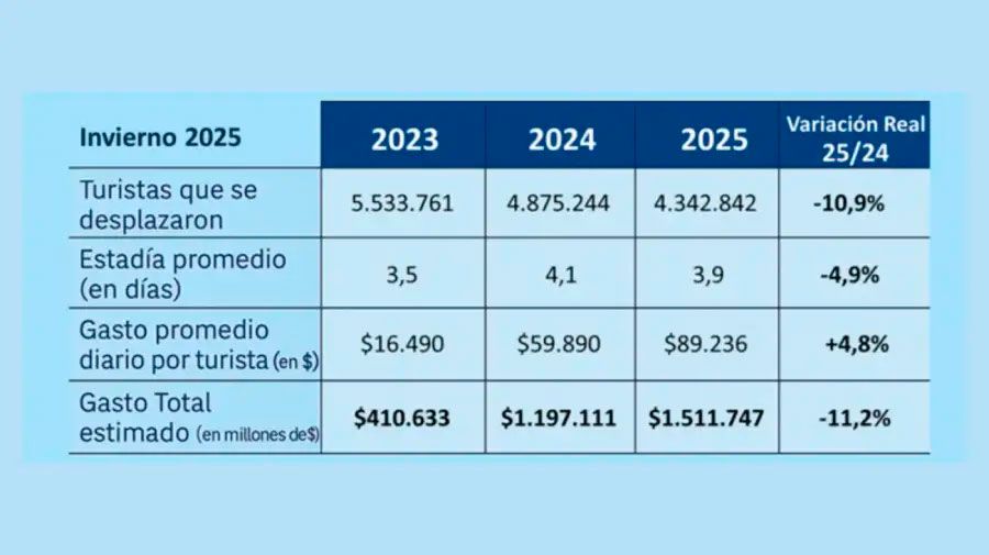 Las vacaciones de invierno 2025 dejaron un impacto económico estimado de $1,5 billones (u$s1.163 millones), según datos del sector. El movimiento turístico fue significativo, con 4,3 millones de personas que viajaron por el país, pero resultó un 10,9% menor al del invierno pasado, afectado por la pérdida de poder adquisitivo, la caída del turismo receptivo y condiciones climáticas poco favorables.