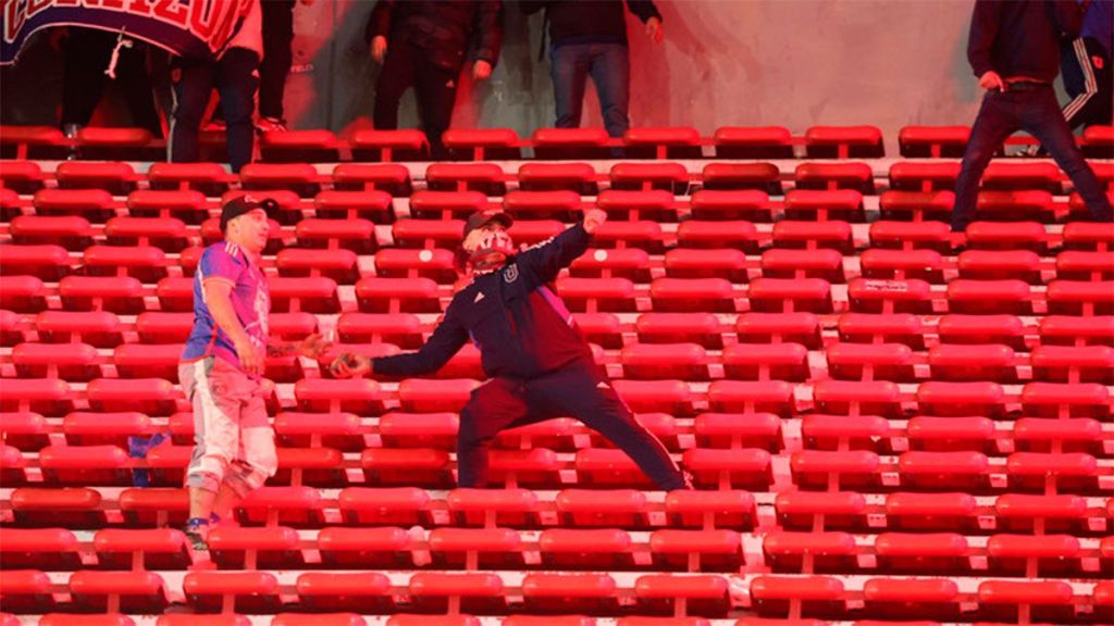 Los disturbios comenzaron durante el primer tiempo, luego de que los hinchas chilenos destruyeran los sanitarios del estadio para convertir la loza en proyectiles que utilizaron para atacar a los fanáticos del Rojo. En la popular baja, los hinchas de Independiente intentaron resguardarse, pero algunos resultaron heridos, como un joven con un corte sangrante en el cuero cabelludo tras ser alcanzado por uno de los lanzamientos.
