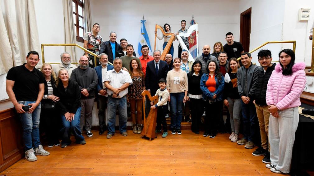 El jefe de Gabinete, Elías Suárez, recibió este jueves por la mañana en Casa de Gobierno a artistas que participarán del 21° Encuentro Latinoamericano Mishquila de Arpas, que se realizará del 20 al 23 de agosto con conciertos en el Centro de Convenciones Fórum y en el Teatro 25 de Mayo.