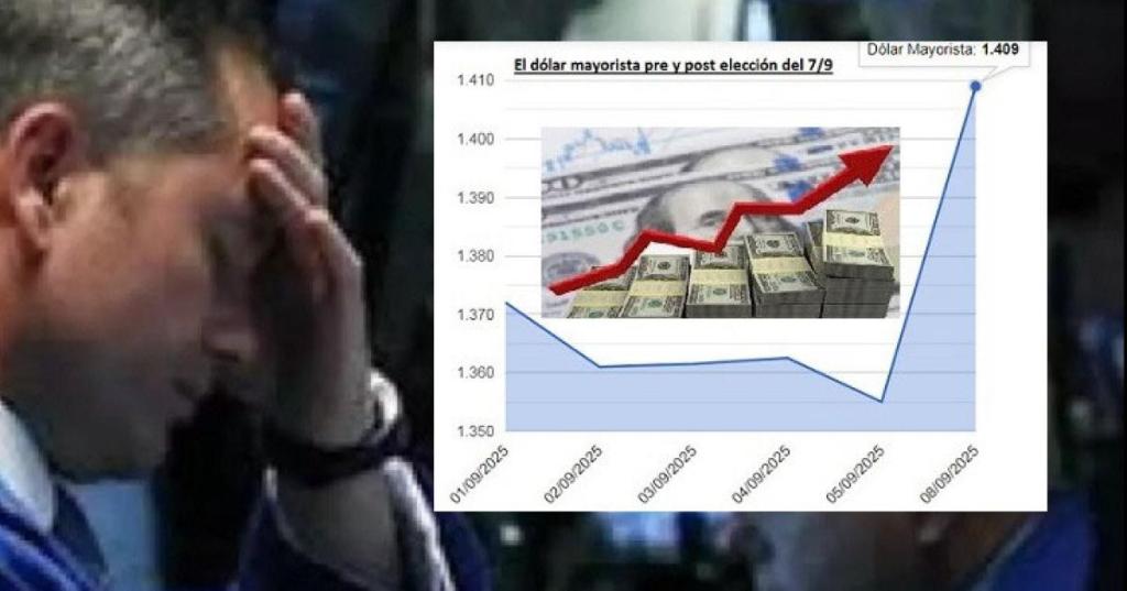 El primer día de mercado luego de la derrota electoral del Gobierno nacional en la provincia de Buenos Aires, el dólar oficial cerró en $1.365 para la compra y $1.425 para la venta en la cotización de Banco Nación, una suba de $45 respecto del viernes pre electoral, aunque el promedio del tipo de cambio en los diferentes bancos alcanzó los $1.450 y en algunos de ellos alcanzó los $1.460. El dólar mayorista -que funciona como precio de referencia en el sistema financiero- saltó $54 y finalizó en $1.409. Este nivel representa un alza del 4% respecto del cierre del viernes anterior y lo dejó apenas a 4,3% del techo previsto en la banda cambiaria